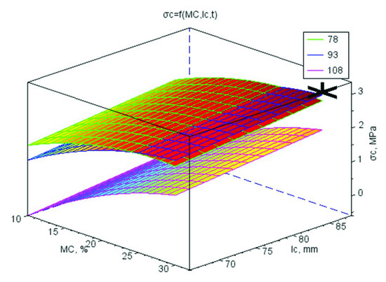 The surface chart of pellet tensile strength σc vs. material moisture MC and die height lc for three material temperature levels t (78, 93, and 108 °C) with the marked optimal point A = 4.00% wt/wt, MC = 30.0% w.b., lc = 86 mm, t = 87.6 °C, for which the optimal value of σc is 3.06 MPa.