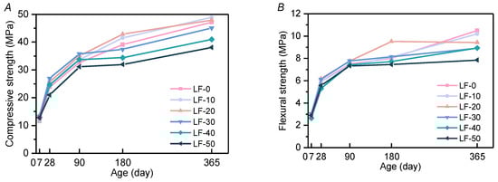 The compressive and flexural strength of the mortar is shown in Figure 1. For the early-age strength of all samples, before 28 days, compressive strength and flexural strength, when increasing limestone powder content, showed a trend of first increasing and then decreasing, which is consistent with previous studies from other composite cementitious materials mixed with limestone powder [31,32]. For the final strength of all samples, both compressive strength and flexural strength varied little when the substitution content of limestone powder was lower. The cement-based material of fly ash was excessively replaced by limestone powder, which will sharply decrease the strength later. This is because limestone powder accelerates the hydration of cement at an early age, promoting the growth of early strength, but too much limestone powder will dilute the strength provided by cement. Additionally, the dilution effect can affect the pozzolanic reaction of fly ash at a later age [33], cause a decrease in final strength. As shown by the slope from 28 days to 365 days in Figure 1, the compressive strength increased largely from 28 days to 365 days in LF-0, LF-10, LF-20, while this strength growth was not so fast corresponding to the low fly ash content of LF-40 and LF-50. However, the appropriate proportion of LP and FA will cause a synergetic interaction, which makes the strength of the mortar increase temporarily at 180 days, as shown by LF-10 and LF-20. The same phenomenon can also be seen in other ternary cementitious materials [34,35].