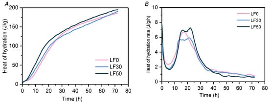 Heat of hydration and heat of hydration rate in LF-0, LF-30 and LF-50 mortar matrix. (A) Heat of hydration, (B) heat of hydration rate.