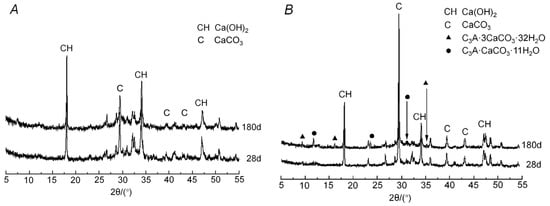 To understand the synergistic hydration interaction of LP and FA, we compared hydration products with pure cement and those with composite cement containing LP and FA. The hydrated cement paste powder of the OPC and LF-30 were tested by XRD at hydration ages of 28 and 180 days. The XRD results are shown in Figure 3. Compared with the main diffraction peaks of these two samples, the main hydration production is Ca(OH)2. In Figure 3A some diffraction peaks were not marked out because of the existent of anhydrous cement particles, hence the production of CaCO3 was mainly caused by carbonation. A synergistic interaction of LP and FA was observed when studying the additional reaction of aluminates. The interaction product was calcium carboaluminate hydrate [8]. The same hydration products of calcium aluminate tricalcium carbonate and calcium aluminate monocarbohydrate could be observed in the XRD of LF-30, proving that the limestone powder participated in the hydration reaction. Therefore, the proper addition of limestone powder can produce stable products and will not significantly reduce strength in a later hydration stage.