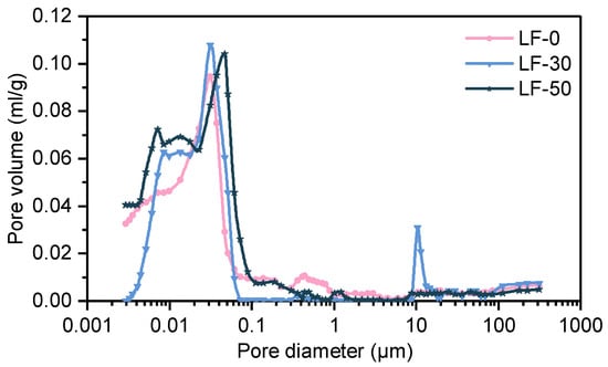 Pore distribution of cement matrix in LF-0, LF-30, and LF-50.