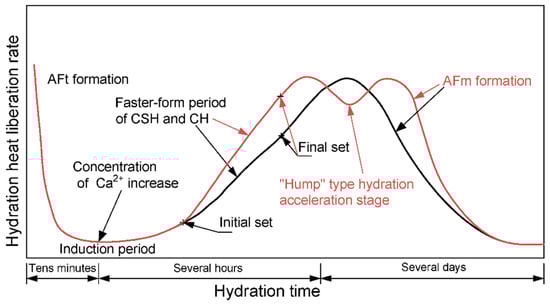 For OPC, the hydration heat liberation rate is a single peak. The whole hydration process can be divided into periods of initial reaction, slow reaction, acceleration, and deceleration [51], which are represented by the black curve in Figure 5 [52]. However, for composite cement containing LP and FA, a “hump-type” hydration acceleration stage can be widely discovered in serial experiments [46,53,54,55], which is generally considered to be caused by the generation of ettringite (AFm formation) [39,40]. The red curve in Figure 5 shows a schematic diagram of the hydration heat liberation rate for composite cement mixed with limestone powder.