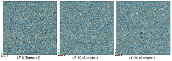 Nine specimens with a size of 40 × 40 mm are constructed. The numerical models of LF-0, LF-30, and LF-50 are made of a mortar matrix, a fine aggregate, ITZ, and pores. For each kind of sample, three specimens that are different in aggregate and pore distribution are generated. One of the three specimens (Sample 1) is shown in Figure 6. The very harmful pores are realized by the random deletion of solid elements in the mortar matrix and ITZ. Here, it is assumed that the position of each component was fixed during the whole hydration process. The effect of fluidity that may lead to the position change of pore was not considered, because the random generation of the three sample can reduce the effect of fluidity. The number of deleted units in the numerical specimens is calculated according to the proportion of the very harmful holes ( > 0.2 μm) in the MIP test results. The proportion of the pore distribution between the cement matrix and ITZ is 2.5:1.