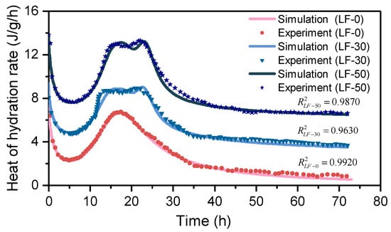 The evolution process simulation of the heat of hydration rate in LF-0, LF-30, and LF-50.
