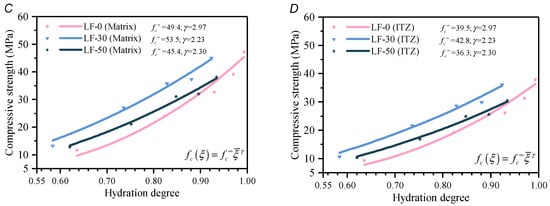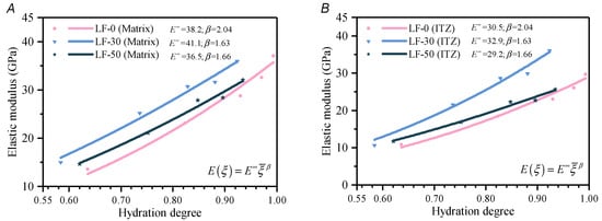 To obtain the relationship between the elastic modulus and compressive strength with the hydration degree in the numerical model, the elastic modulus of different ages is calculated by the method of the Chinese National Standard GB 50010-2010). Of course, other method mentioned in CEMHYD3D, HYMOSTRUC, etc., can also be used. The calculated elastic modulus is then matched with the degree hydration calculated by the chemical–thermal coupling method, and so is the compressive strength. The relationship above is developed by Equations (11) and (13). Figure 8 shows the elastic modulus and compressive strength evolution process of the matrix and the ITZ in LF-0, LF-30, and LF-50. Generally, the mechanical properties of the ITZ are 50–80% of the matrix, which is related to the bonding ability between the blend paste and aggregate [66,67]. The parameters of ITZ is reduced to 80% of that in the matrix [68,69], because the ITZ was only solid elements in the random pore model. It is worth noting that the elastic modulus parameters have been processed by a random pore model based on GMR theory, where J is 0.261, because the porosity of each component of the three mortars is within the appropriate range (porosity ≤ 0.3) [63].