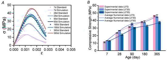 Strength–strain curves of the mortar specimens LF-30 at 7/28/90/180/365 days of age, and the comparison of the compressive strength between tested in physical experiments and the numerical simulation. (A) simulation of strength–strain curves at different days of age; (B) simulation of compressive strength at different days of age.