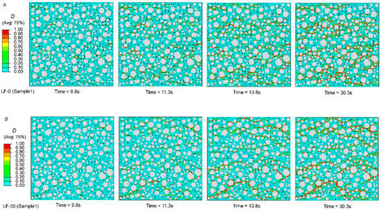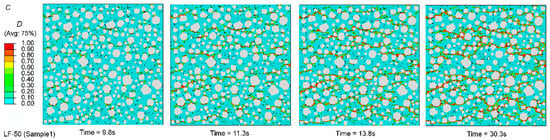 The damage factors can reflect the crack state. For the porous mortar specimen, the cracks first appear in the porous zone of ITZ, then develop along the porous zone of the matrix, and then gradually form complete cracks, which can be seen in Figure 10. The figure shows the evolution of damage factor distribution of the mortar specimens LF-0, LF-30, and LF-50 at the age of 28 days. After comparing the distribution of the damage factors of the three kinds of mixed mortar specimens, it can be proved that the more pores there are, the greater the probability of multiple cracks. This phenomenon can be explained by the filling effect of limestone powder [70]. Corresponding to the mortar specimen, the number of cracks in the mortar mixed with limestone powder is reduced because of the low porosity. This may be the reason for the high strength at early age.