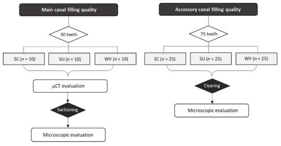 Flowchart representing the experimental procedure. SC: single-cone technique, SU: single-cone technique with ultrasonic activation, WV: warm vertical compaction.