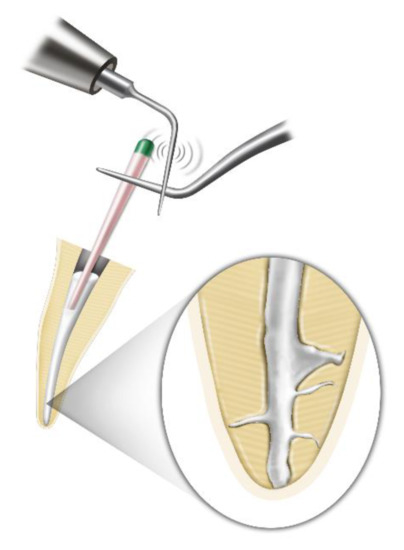 Figure 2. Illustration of the ultrasonic-mediated activation for the main and accessory canal fillings. - WV group (warm vertical compaction): After each canal was filled with the sealer and GP cone, the inserted GP cone was compacted using SuperEndo B&L Alpha II (B&L Biotech, Ansan, Korea) to within 3 to 5 mm of the working length. We then backfilled the canal using SuperEndo B&L beta (B&L Biotech).