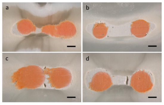 After the μCT examination, each sample was sectioned into six slices of 1.5 ± 0.1 mm each using a diamond-coated saw (Isomet; Buehler, Chicago, IL, USA). Then, every two slices were obtained from the coronal, middle, or apical parts. These slices were analyzed using a stereomicroscope (MZ16FA; Leica Microsystems, Wetzlar, Germany) and photographed. The number of voids was counted from these photographs and scored (Table 1). The scoring was evaluated by two observers who were not aware of the filling methods used (Figure 4). Measurements were done twice and the mean was calculated for each section.