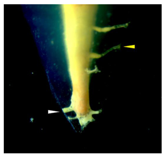 Representative image of a transparent root apex showing complete (white arrow) and partial (yellow arrow) filling of an accessory canal.