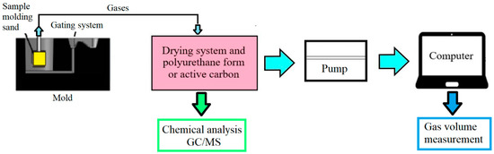Investigations of the gas emission in the tested foundry plant were performed according to the original method developed in the Faculty of Foundry Engineering, AGH-UST (Polish Patent, No. P-398 709; 2012). The schematic presentation of the experimental stand is given in Figure 1.