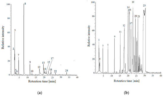 (a) Chromatogram obtained for the sample of furan resin (FNB) binder at the temperature of 1100 °C; and (b) chromatogram obtained for the sample of phenol-formaldehyde (PFNB) resin binder at the temperature of 1100 °C [31].