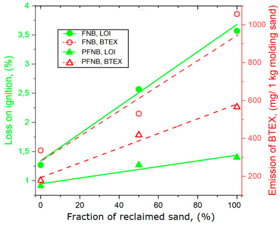 An addition of the reclaimed sands to matrices of both molding sands caused a significant increase in the volume of emitted gases. For the FNB sand, this volume doubled (when the matrix was made of 100% of reclaimed sand), while for the PFNB sand the increase was lower (70%) (Table 2 and Table 6). The mechanical reclamation process of spent molding sand does not fully remove the hardened binder from sand grains. Thus, by adding the reclaimed sand to sand matrices, additional amounts of inactive binder are introduced into molding sands, increasing the volume of emitted gases and constituting a higher risk to the environment. The parameter LOI can be a measure of the binder remaining on the reclaimed sand grains. The dependence of the LOI of the given molding sand on the reclaimed sand fraction in its matrix is presented in Figure 3. Both the BTEX emission and the LOI values are proportional to the fraction of reclaimed sand (Figure 3). The LOI for the tested molding sand should be ≤2; this level of organic substances can be obtained by thermal reclamation [23]. However, high costs of energy carriers lead foundries to mainly apply mechanical reclamation, which is less efficient. Not totally removing binders from sand grain surfaces can be the reason for casting defects, due to emission of too high amounts of gases and environmental contamination.