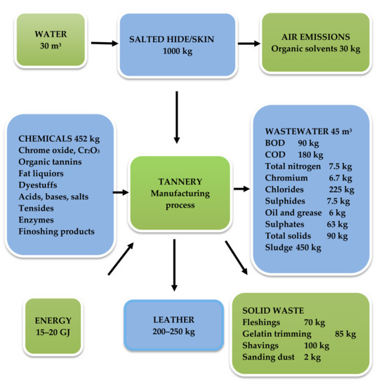 Wastewater in an amount of cca 45 m3/tonne of raw hides contain salts, especially chlorides, fats, proteins, preservatives (soaking), lime and ammonium salts, ammonia and sulphides (fleshing, trimming, and bating), chromium salts, and polyphenolic compounds (tanning); dyes and solvents (wet-finishing), and around 450 kg sludge. Each tonne of raw hides results in 200–250 kg leather, while untanned solid waste is around 250 kg from the operations of slaughterhouses (trimming, shaving, and fleshing); the total solid waste that is produced is about 450–600 kg [5,28].
