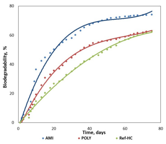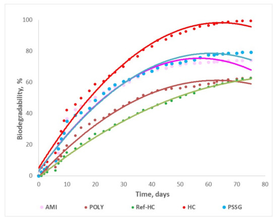 - The stationary zone, where the biodegradation degree reaches its maximum value and the process rate tends to zero (41–75 days).