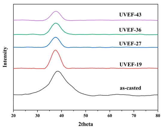 Figure 2 is a comparison of the XRD patterns of the as-cast and UVEF-treated samples. It can be found that the XRD diffraction peaks of the UVEF-treated samples are consistent with those of the as-cast samples. There are broad diffusion peaks without any obvious crystalline peaks in both cases, which indicates that the as-cast and UVEF-treated samples are all amorphous, and ultrasonic vibration-assisted elastic deformation does not cause the amorphous material to crystallize. Regarding the naming convention, the UVEF-19 sample is an amorphous sample treated by ultrasonic vibration-assisted elastic deformation with an amplitude of 19 μm.