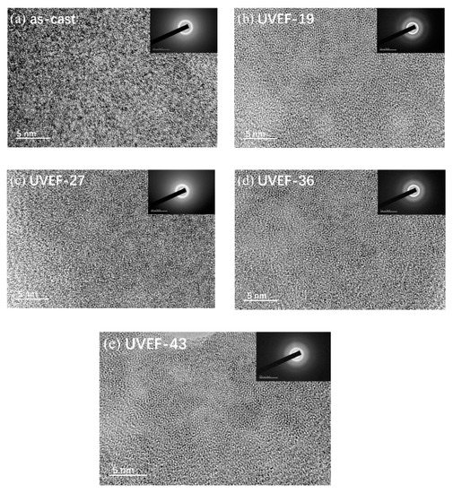 To further confirm the amorphous properties of the as-cast and UVEF-treated samples, high-resolution TEM is used to obtain an image of the microstructure of the sample, which is shown in Figure 3. No nanocrystals are found in the as-cast samples or the UVEF-treated samples, and the microstructure of all samples shows labyrinth-like characteristics similar to those of an amorphous state, which is consistent with the XRD test results.