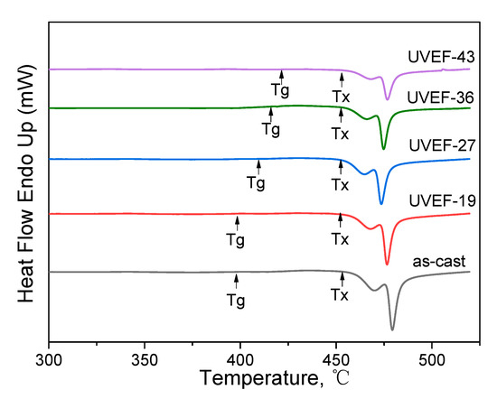 The as-cast and UVEF-treated samples are analyzed by DSC, and the thermodynamic properties of the samples are obtained from the DSC curve. As shown in Figure 4, the DSC curves of all samples show an endothermic phenomenon starting from the Tg temperature, which is a characteristic of glass transition, and then exhibit an exothermic phenomenon corresponding to the crystallization behavior to the Tx temperature. The values of Tg and Tx for as-cast and UVEF treated samples as shown in Table 1.