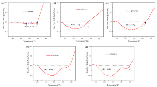 Relaxation enthalpy ΔH of the as-cast and UVEF-treated samples (a) as-cast; (b) UVEF-19; (c) UVEF-27; (d) UVEF-36; and (e) UVEF-43.