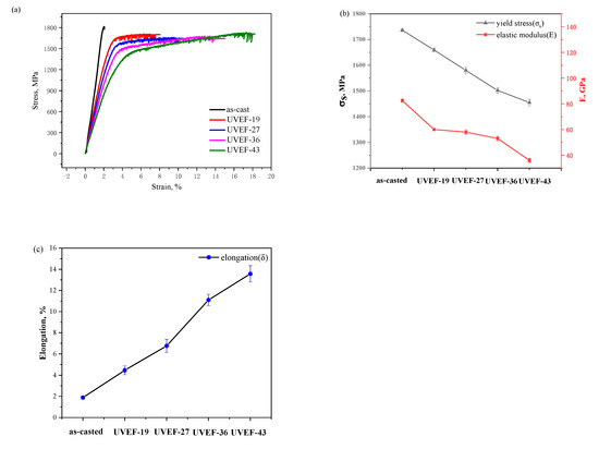 (a) Compression fracture stress–strain curves of as-cast and UVEF-treated samples (b) values of the yield stress and elastic modulus, and (c) elongation of the as-cast and UVEF treated samples.