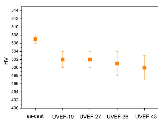 Comparison of the microhardness of the as-cast and UVEF-treated samples.