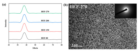 From a comparison of XRD patterns of hot-compressed elastic deformation (HEF)-treated samples in Figure 9a, it can be found that the HEF-treated samples have broad diffusion peaks and no obvious crystalline peaks, which proves that the HEF-treated samples are still all amorphous. Regarding the sample naming convention, HEF-80 refers to amorphous samples processed by hot-compressed elastic deformation at a temperature of 80 °C. The microscopic morphology observed with TEM shown in Figure 9b indicates that the HEF-treated sample shows a maze-like amorphous structure, and no nanocrystals are found.