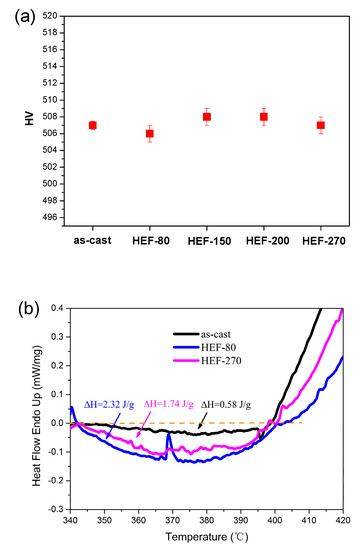 (a) Comparison of microhardness of the as-cast and HEF-treated samples and (b) comparison of relaxation enthalpies of the as-cast and HEF-treated samples.