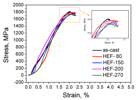 Fracture stress–strain curve of the as-cast and HEF-treated samples.