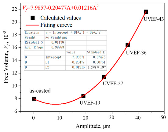 The amount of free volume of the UVEF-treated sample can be obtained according to Equation (2), as shown in Figure 12. It can be found that the larger the amplitude of the UVEF-treated sample is, the greater the free volume. Finally, using polynomial fitting, the coefficient of determination for curve fitting is 0.99983, the mathematical model to obtain the ultrasonic amplitude (A) and free volume (vf) is obtained as follows: