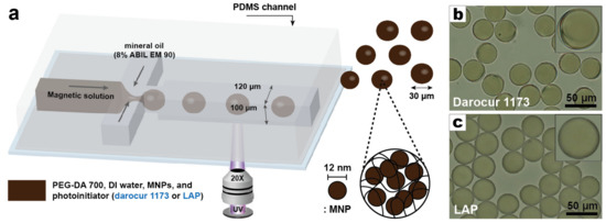 Two photoinitiators, lithium phenyl (2,4,6–trimethylbenzoyl) phosphinate (LAP, TCI, Tokyo, Japan) and 2–hydroxy–2–methylpropiophenone (Darocur 1173, Sigma-Aldrich, St. Louis, MO, USA) were used to manufacture the dispersed phases. The MNP solution, poly(ethylene glycol) (700) diacrylate (PEG-DA 700, Sigma-Aldrich, St. Louis, MO, USA), and DI water were mixed in a volume ratio of 4:4:2 with 0.5% (w/v) LAP for the first phase. For the second phase, the MNP solution, poly(ethylene glycol) (700) diacrylate, and DI water were mixed in a volume ratio of 8:8:3 with 5% (v/v) Darocur 1173. Although Darocur 1173 has low water solubility, it was able to be well-solubilized in dispersed phase without phase separation due to the amphiphilicity of PEG-DA 700. A mixture of 92% mineral oil (Sigma-Aldrich, St. Louis, MO, USA) (v/v) and 8% ABIL® EM 90 (Evonik Industries AG, Essen, Germany) (v/v) was used as a continuous phase. For the structural uniformity observation of magnetic hydrogels, 10 mg/mL of 2% (v/v) methacryloxyethyl thiocarbamoyl rhodamine B (Polysciences, Inc., Warrington, PA, USA) was added to each manufactured dispersed phase.