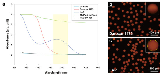 The absorbance of all the materials, deionized water, MNP solution, monomers, and photoinitiators, which comprise the dispersed phase, were characterized using the UV absorbance mode of a SpectraMax id5 multimode microplate reader (Molecular Devices, San Jose, CA, USA). The entire process was performed on a clear 96-well plate (Corning, Costar, Corning, NY, USA) at 25 °C. Measurements were taken at intervals of 1 nm from UV wavelengths of 300 and 500 nm.