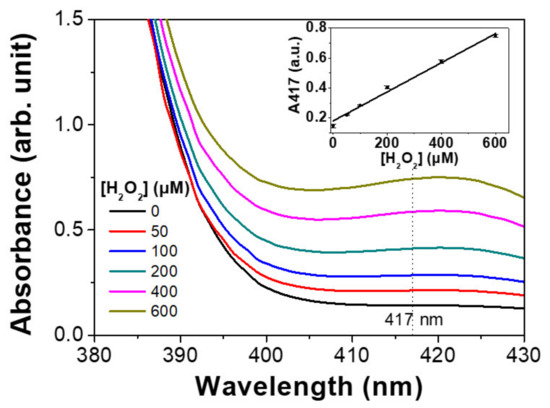 Colorimetric detection of H2O2 using magnetic hydrogels. Absorption spectra of 2,2–azino–bis (3–ethylbenzothiazoline–6–sulfonic acid) diammonium salt (ABTS) oxidation in magnetic hydrogels as a function of H2O2 concentration. Inset: absorbance at 417 nm as a function of H2O2 concentration.