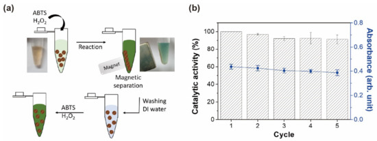 The reusability of the magnetic hydrogels was investigated by the catalytic oxidation of ABTS in the presence of H2O2. A solution containing 420 μL of sodium acetate buffer (0.2 M, pH of 4.0), 60 μL of magnetic hydrogels (0.2 Fe mg/mL), 60 μL of H2O2 solution (5 mM), and 20 μL of ABTS (60 mM) was added into a microtube and incubated at RT for 10 min. After the reaction, the magnetic hydrogels were separated from the mixtures through the application of an external magnetic field for 15 s. Subsequently, 400 μL of the supernatant was collected, and the absorbance at 417 nm was measured. After washing with DI water by vortexing for 2 min, the magnetic hydrogels were reused for the next catalytic oxidation under the same conditions.
