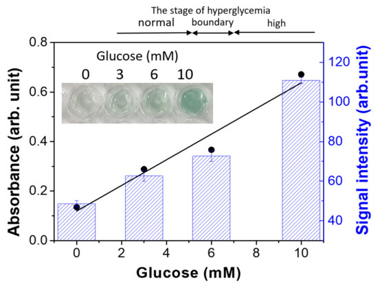 Glucose detection is a popular H2O2-mediated bioassay [49], yet there is still great demand for simple and facile methods for diabetes monitoring. Colorimetric assays have received much attention because of their cost-effective and user-friendly outputs, such as sample detection that can be easily captured and interpreted using smartphones [50]. For glucose detection, GOx was used to catalyze the oxidation of glucose. H2O2 was generated by the reduction of oxygen, depending on the concentration of glucose. Glucose model solutions were prepared with representative levels of glucose corresponding to the normal, boundary, and high stages of hyperglycemia (normal: ≤5.6 mM, boundary: 5.6–7 mM, and high: >7 mM) [51]. The absorbance from the resulting solutions was measured at 417 nm (Figure S8), and a photographic image was taken by a smartphone (Figure 5). The absorbance showed a linear correlation with glucose concentration in the solution, and the “hyperglycemia” model solution exhibited a green color that was distinguishable by the naked eye. The intensity of each well from the photograph was calculated using ImageJ, with the hyperglycemia signal being distinguishable from the normal and boundary signals.