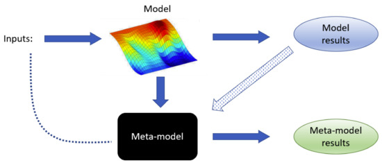 One important limitation of GSA techniques is that they require large amounts of simulated data as input. Numerical experiments obtained, for instance, through finite element (FE) simulations, demand a huge amount of computational resources that are often unavailable. A convenient remedy to this problem is to employ meta-models that provide reasonable approximations to the models’ response, but at a fraction of their computational cost. These types of models are built by sampling the original ones, as illustrated in Figure 1, and were originally proposed to optimize processes [3]. Initially known as Response Surface Models (RSM), they rapidly evolved and became emulators of computational codes at a very reduced cost. As a result, they have been utilized in a wide range of sensitivity analyses and applications [4,5,6].