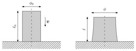 The methodology presented in Section 2 is applied now to a relevant example in mechanics of deformable solids, namely, Taylor’s impact test [21,22]. In what follows, we will study the calibration of the three material models of Section 2.4 based on the outputs obtained from this well-known test that consists of a high-velocity impact of a metallic anvil onto a rigid wall. As illustrated in Figure 2, the impact creates irrecoverable deformations in the anvil that, due to the symmetry of the problem, can be macroscopically quantified by measuring the changes in the diameter and length of the impactor.