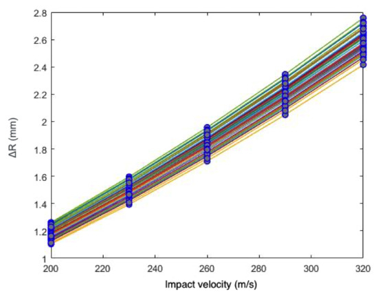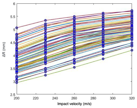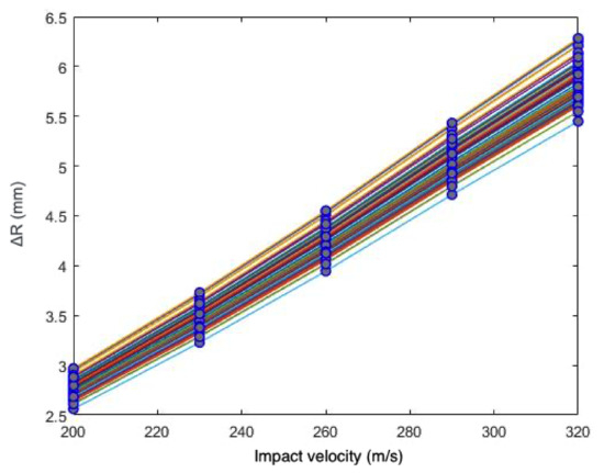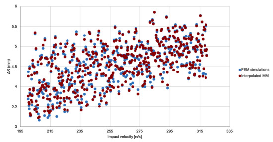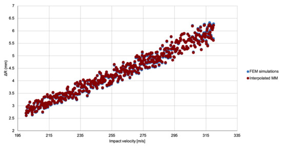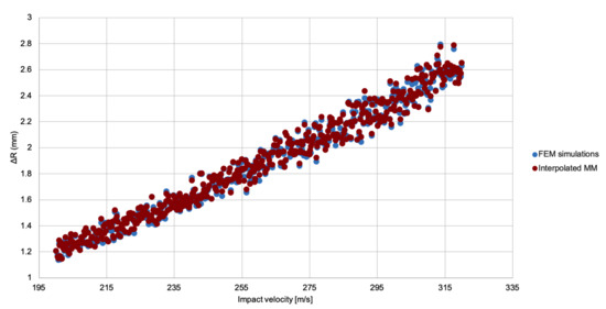 Once accepted, this strategy for combining meta-models will result in an extremely cheap source of simulated data that will be used to study the material models. For each of the latter, the fitting data will consist of sets of observed points , plus sets of computational outputs, derived from the meta-models interpolation, , where and are the experimental impact velocities and interpolated impact velocities acting as the variable input, respectively, while are the parameter inputs to the meta-model. To assess the results of the meta-models interpolation, the FE cases against which are to be compared will be generated employing the same parameter inputs and impact velocities .