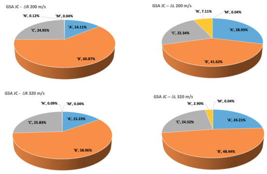 Global Sensitivity Analysis (GSA) results for the Johnson–Cook (JC) model considering and at 200 and .