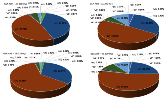 First, we present the results of the sensitivity analyses, as summarized in the pie charts of Figure 7, Figure 8 and Figure 9. For each of the three material models, these figures depict the contributions, at two impact velocities, of the parameters to global variance, considering independently the two QoIs: namely, the increments in anvil’s radius and length.
