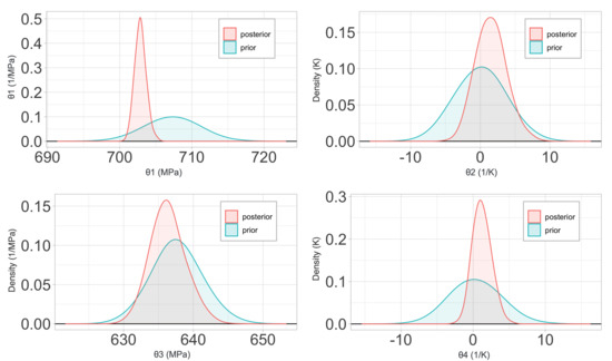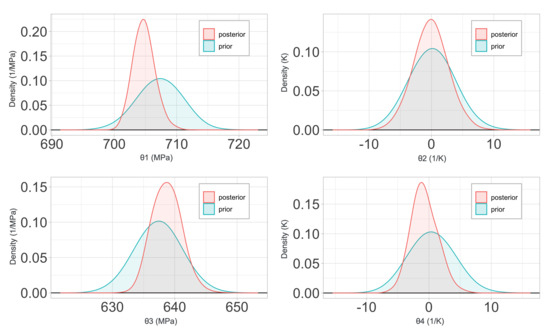 Regarding the calibration of the Arrhenius model, it can be observed from Figure 17 and Figure 18 that the variance reduction in the posterior probability distribution of its parameters is not as strong as for the Johnson–Cook constitutive law, although it is still significant when compared to the Zerilli–Armstrong case. Something similar happens when analyzing the (mean) calibrated parameters when considering the two QoIs. Even if there is a good agreement among them, the calibrated parameter obtained for the two QoI is fairly different. A potential explanation can be found, again, in the complexity of the constitutive equation and the effects of ignoring a large number of the model parameters. While this conscious choice saves much computational cost, it causes the loss of information in the model behavior, that, either way, could be countered to a large extent with additional simulated data at a low computational cost.