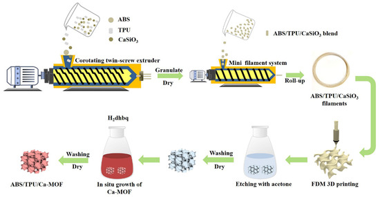 As shown in Figure 1, the dried ABS, TPU and CaSiO3 were premixed on a homogenizer(Nissin Electrical Co., Ltd., Jiangsu, China) and then extruded on a POTOP MEDI−22/40 co-rotating twin-screw extruder with a screw diameter of 22 mm (POTOP Experimental Analysis Instrument Co., Ltd., Guangzhou, China). The temperatures of the extruder were set to be 100, 125, 145, 160, 170, 175, 175, 170, 155 and 145 °C from the feed zone to the die, respectively. The rotation speed of the screw was 200 rpm. The strap of blends was cooled, granulated and dried in a vacuum oven(Yongguangming Medical Instrument Co., Ltd., Beijing, China) at 60 °C overnight. The mass rate of ABS/TPU was fixed at 80/20 and the dosage of CaSiO3 powder was 40 phr. The dried CaSiO3/ABS/TPU pellets were employed as raw materials, and filaments were extruded on a two-heating zone mini filament system (Wellzoon Type C, Mistar Technology Co., Ltd., Shenzhen, China) with a screw speed of 15 rpm at temperatures of 155 and 175 °C. The obtained CaSiO3/ABS/TPU filaments possess an average diameter of 1.75 mm.