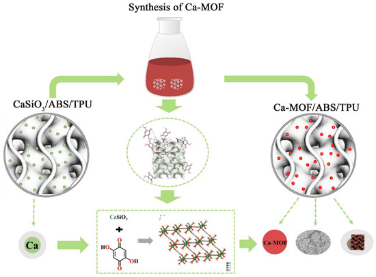 The prepared CaSiO3/ABS/TPU 3D printed skeleton was etched in acetone for 5 min to expose more CaSiO3 on the surface for providing MOFs loading substrate and growth sites. The clean and dried acetone-etched skeleton was immersed in a solution of H2dhbq (0.1 g/L, 50 mL) for 12 h to grow Ca-MOF on the surface of the skeleton (Figure 2). The Ca-MOF/ABS/TPU 3D skeleton then was washed with methanol and dried at 80 °C overnight. The ABS/TPU 3D skeleton without MOF denoted as ABS/TPU−2 3D skeleton was also prepared for comparison. Pure Ca-MOF powder without ABS/TPU was synthesized according to the method in the literature [30].