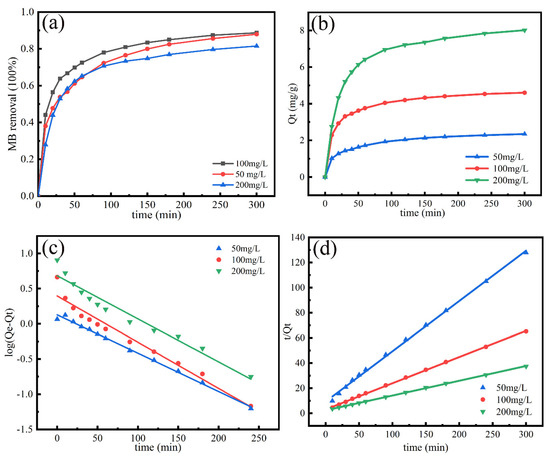 The adsorption kinetics experiment of MB with various initial concentrations (50, 100, 200 mg/L) on the Ca-MOF/ABS/TPU 3D skeleton were performed at 298.15 K [16]. The results are given in Figure 9. The pseudo-first-order and pseudo-second-order models are applied to analyze the experimental data for MB adsorption process (Figure 9c,d), and the calculated parameters are tabulated in Table 2. As shown in Figure 9a, the adsorption curves raise sharply when adsorption time increases from the initial one to 60 min. The MB removal ratios from aqueous solutions with various concentrations are 65%, 72% and 65% at the reaction time of 60 min. At the initial time, the presence of a large number of adsorption sites on the surface of the material leads to a rapid MB adsorption. The adsorption rate slowly increases after 60 min due to the decrement of adsorption sites by occupation of MB molecules on the surface of the material. The adsorption equilibrium is reached at 300 min and the adsorption capability at the equilibrium time is 88%, 88% and 81% respectively. Notably, 50 mg/L gives the lowest adsorption speed due to the low MB concentration. However, the MB removal efficient for 200 mg/L is found to be lower than those for 50 and 100 mg/L. The result may be attributed to the adsorption saturation of the Ca-MOF/ABS/TPU 3D skeleton at a high MB concentration. The results indicate that the proposed Ca-MOF/ABS/TPU 3D skeleton is a candidate absorbent with rapid adsorption speed, high adsorption ability for removal of dye contaminations from aqueous.