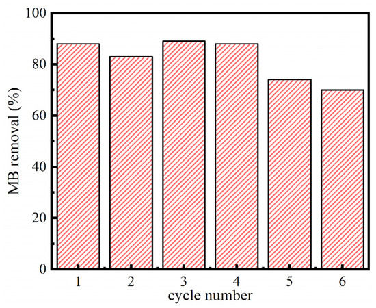 The reusability of the Ca-MOF/ABS/TPU 3D skeleton was evaluated over six cycles and the results are given in Figure 10. It is observed that the removal capability gives almost no decrease by four adsorption–desorption runs. The removal ratio remains at 74% and 70% for the fifth and sixth runs, indicating that the prepared Ca-MOF/ABS/TPU 3D skeleton possessed a good reusability for MB removal. The decrement is suggested to be caused by the drop of Ca-MOF by a little extent from the skeleton surface in the process of adsorption–desorption.