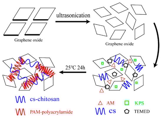 The expanded graphite (300-mesh) used in the experiment was purchased from Qingdao Henglide Graphite Co., Ltd. (Qingdao, China). In addition, acrylamide (AM) (CH2=CHCONH2), chitosan (CS), potassium permanganate (KMnO4), hydrogen peroxide (H2O2), sodium nitrate (NaNO3), 30 wt% diluted hydrochloric acid (HCl), concentrated sulfuric acid 98 wt% (H2SO4), N,N,N′,N′-tetramethylethylenediamine (TEMED) ((CH3)2NCH2CH2N(CH3)2), and potassium persulfate (KPS) were all purchased from Aladdin Reagent (Qingdao, China).