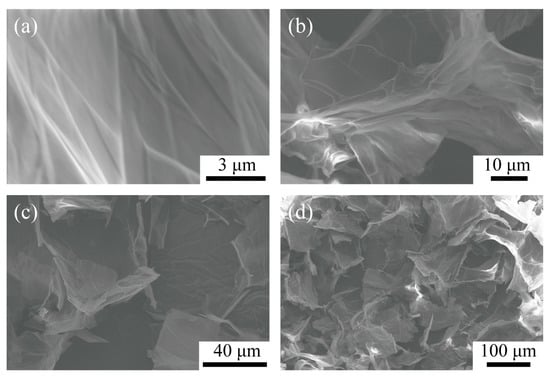 SEM images of CAG-GO20%. (a) Magnify 30,000 times. (b) Magnify 7000 times. (c) Magnify 2500 times. (d) Magnify 680 times.