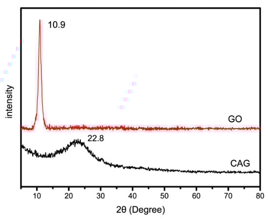 As shown in Figure 3, the abscissa is the peak position, that is, the 2θ position of the diffraction peak. The ordinate is the peak height, representing the peak height intensity, in the XRD pattern of the GO nanosheets, a narrow strong diffraction peak was detected at 2θ = 10.9°, corresponding to an interlayer distance of 0.810 nm, which was consistent with the reported literature [23]. However, in the synthetic composite material CAG-GO20%, a wider diffraction peak was detected at 2θ = 22.8°, while the strong diffraction peak of GO completely disappeared, indicating that the materials were successfully combined. This can also indicate that GO nanosheets are uniformly dispersed in the CAG material without coacervation, the material is amorphous, and GO lost its original structure.
