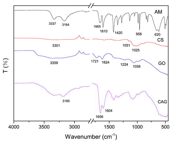 FT-IR spectra of AM, CS, GO, and CAG-GO20%.