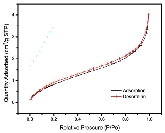 As shown in Figure 5, after the BET test of the CAG-GO20% nanocomposite, its specific surface area was found to be 3.7603 m2/g, it belongs to type II isotherm. Single point surface area at P/Po = 0.250057140, which is the first steep part of the isotherm, it indicates the saturated adsorption capacity of the monolayer, which is equivalent to the completion of the monolayer adsorption. With the increase of relative pressure, a long and slowly rising platform appeared, which indicated that the adsorption gradually diffused from the surface monolayer to the inner molecular layer, and multilayer adsorption began. When the relative pressure is high, capillary condensation occurs.